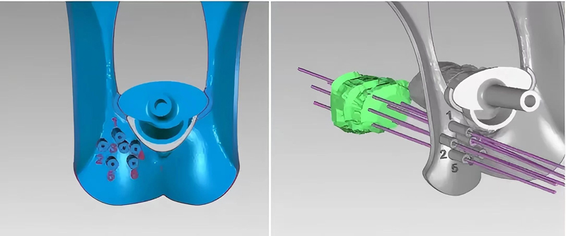 3D打印模具及内置的插植针针道,是根据患者的阴道扩张度、肿瘤在三维空间的形态和体积、以及周边危及器官的位置为每一位患者“量身定制”,能精确引导插植针定位,使插植针分布更合理,操作更加稳定顺畅,减少不必要的布针及损伤和疼痛。对于侵犯范围较大、不规则形态肿瘤能实现良好的剂量覆盖,有效降低危及器官剂量,提升疗效、降低副作用。