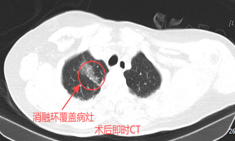 在征得患者及家属同意后,刘冰主任带领团队进行了肺部多发结节微波消融术。术中,选取患者合适体位,CT确认进针通道,然后在CT引导下精准置入微波消融针至结节处进行消融。40分钟后,手术顺利完成,复查胸部CT显示:消融治疗范围覆盖目标病灶,无气胸及出血。术后患者没有特殊不适,安全返回病房。